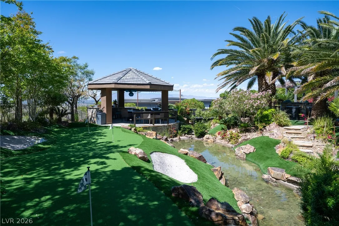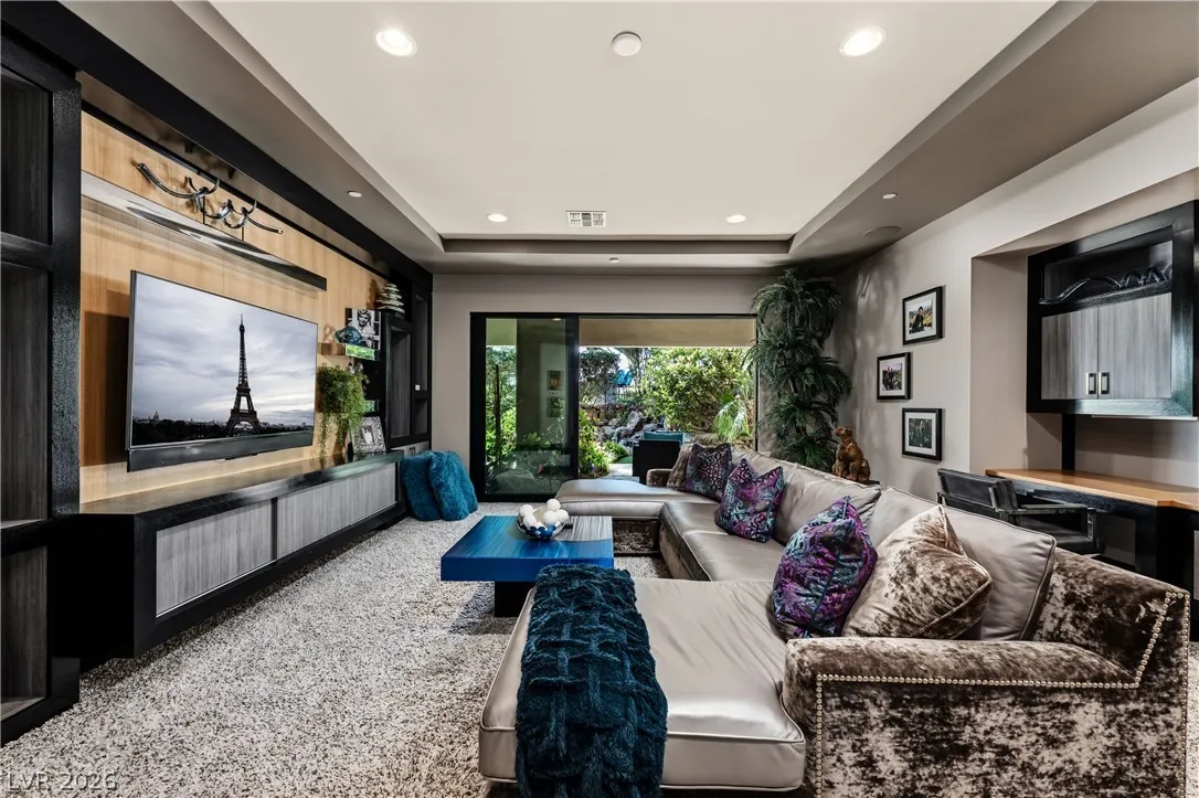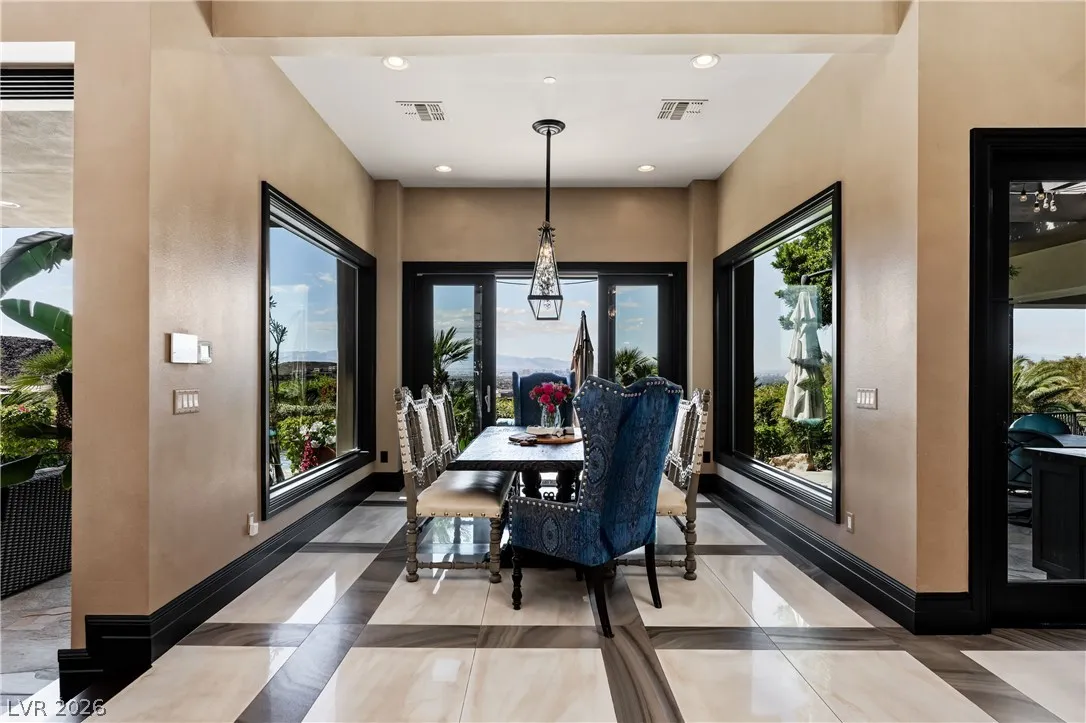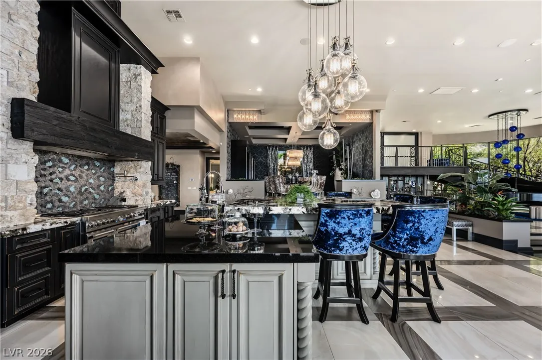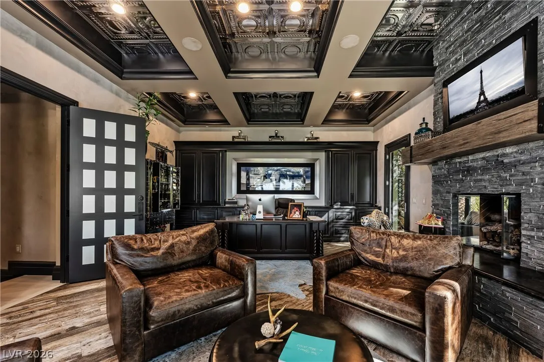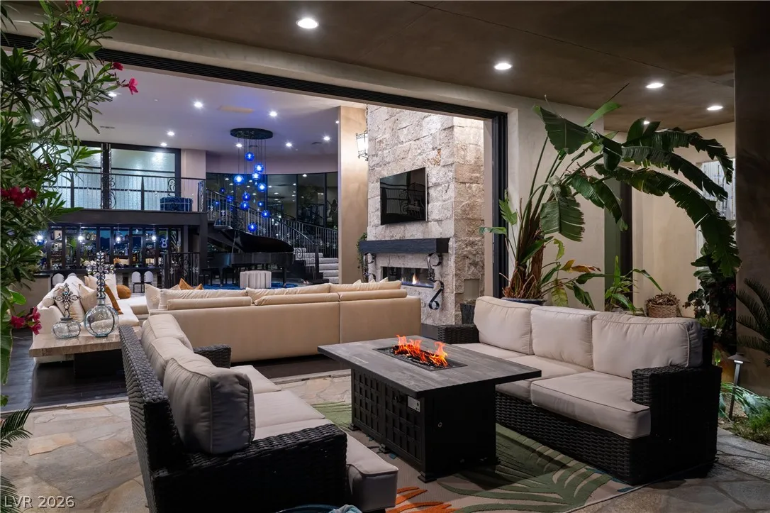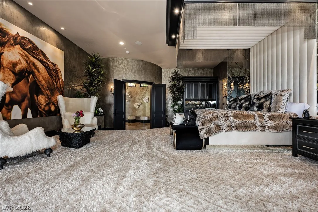 Step into a realm where luxury meets the sky. This 6-bedroom masterpiece frames unobstructed Las Vegas Strip views through floor-to-ceiling retractable glass, merging indoor elegance with an outdoor oasis. A grand staircase and sacred Tibetan stone fireplace anchor the living space, while the gourmet kitchen — with its extended island, butler’s pantry, and cocktail bar — invites culinary artistry. Retreat to the primary suite, featuring a private coffee bar, fireside sitting area, and panoramic balcony. Outside, a resort awaits: 2 pools, 2 spas, 7 cascading waterfalls, and an outdoor kitchen. Indulge in the 12-seat theater, wellness wing with steam/sauna, gym, and wine grotto. Set within the prestigious, guard-gated MacDonald Highlands, this estate offers an exclusive lifestyle defined by privacy, security, and world-class amenities. Opportunities to own a sanctuary of this magnitude, complete with a 7-car garage and multi-gen ensuites, are exceedingly rare. A true entertainer’s dream.