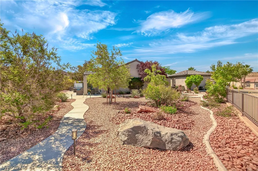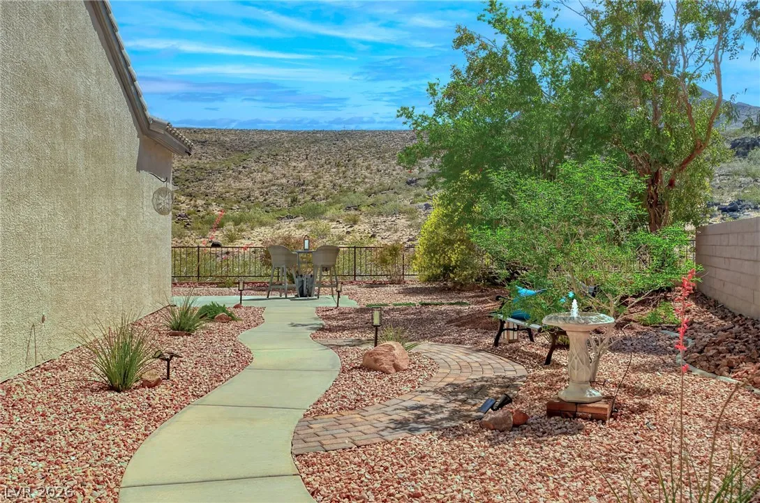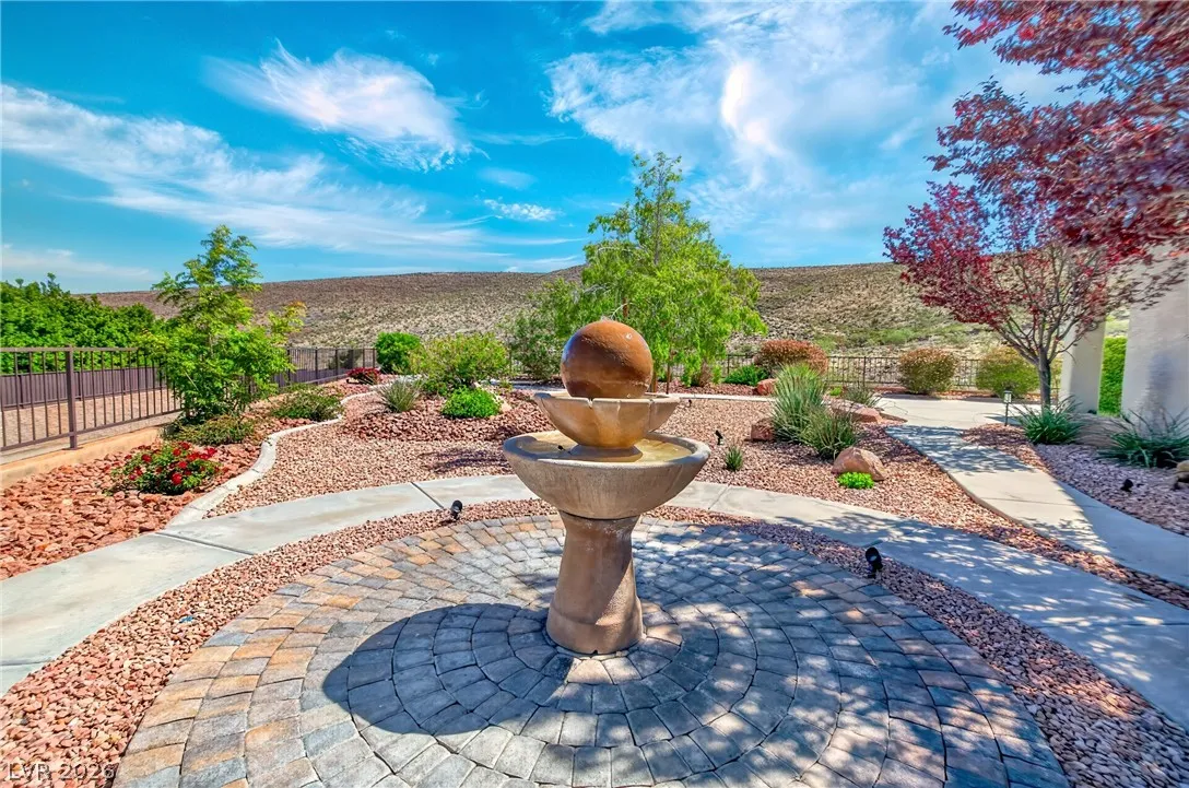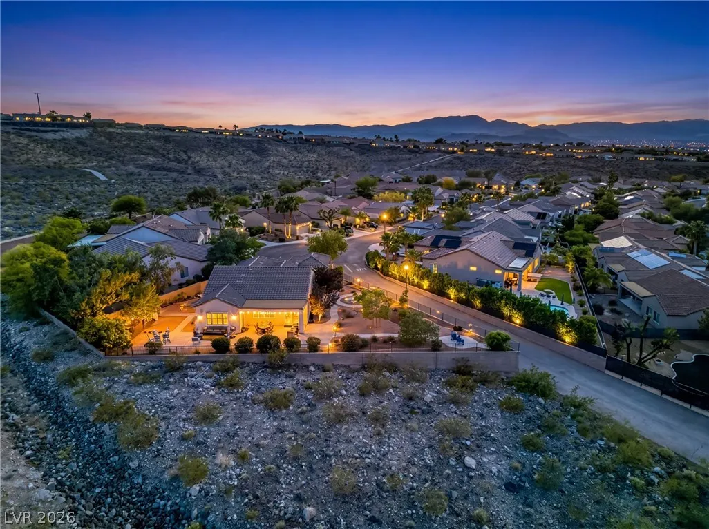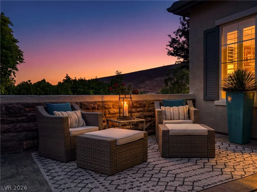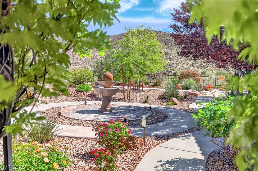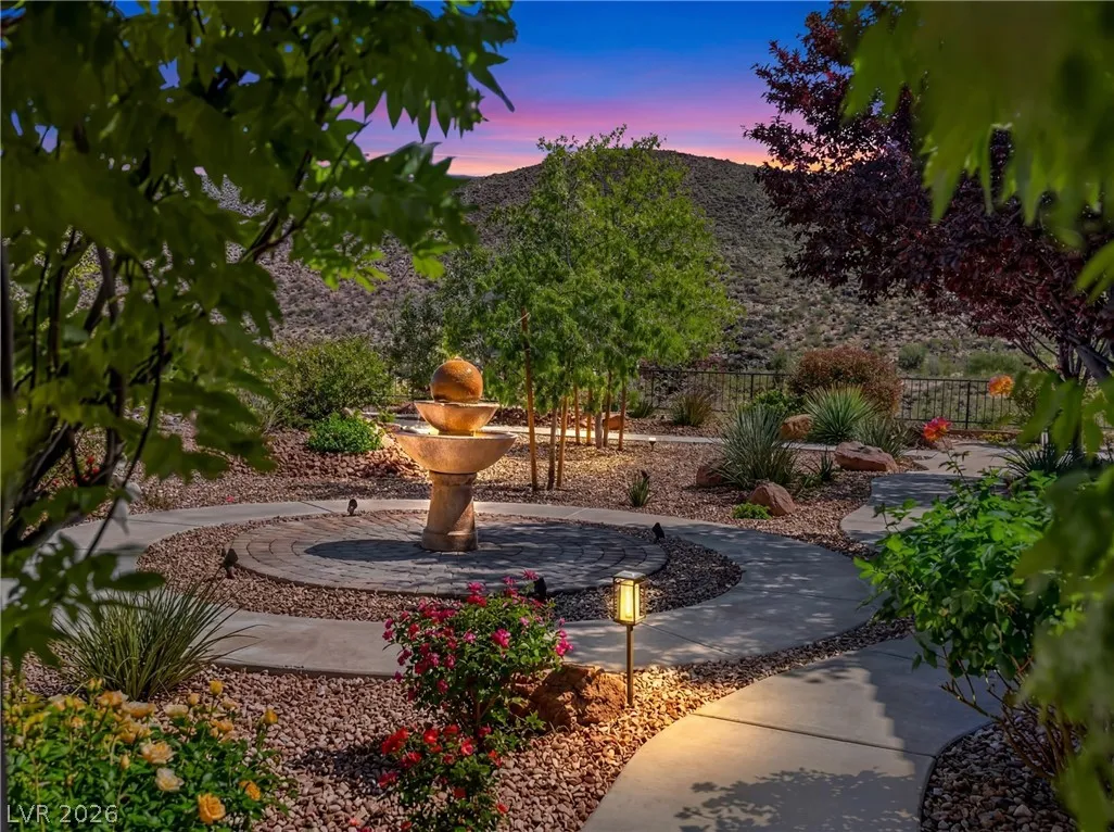Meticulous, premium home nestled in the hills of Henderson, offering a truly one-of-a-kind opportunity. Positioned at the top of a private cul-de-sac, this residence delivers exceptional privacy and an elevated setting with stunning surroundings. Pride of ownership is evident throughout, with every detail maintained to perfection, creating a desert oasis with lush accents and calming ambiance. This model-esque home showcases a refined designer’s touch across both the interior and exterior, complemented by thoughtfully selected landscaping and tranquil water features that enhance the ambiance. Situated on a rare 10,000+ sq ft lot, the property captures breathtaking mountain views. Dual courtyards create a warm and inviting flow—one leading to the private casita and the other tucked between the casita and main home, offering added privacy and seclusion. Scenic hiking trails begin just steps away, while elegant twilight lighting transforms the grounds each evening into a stunning retreat.