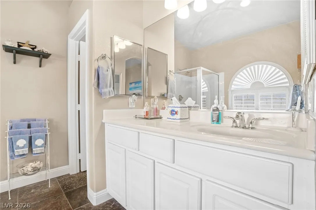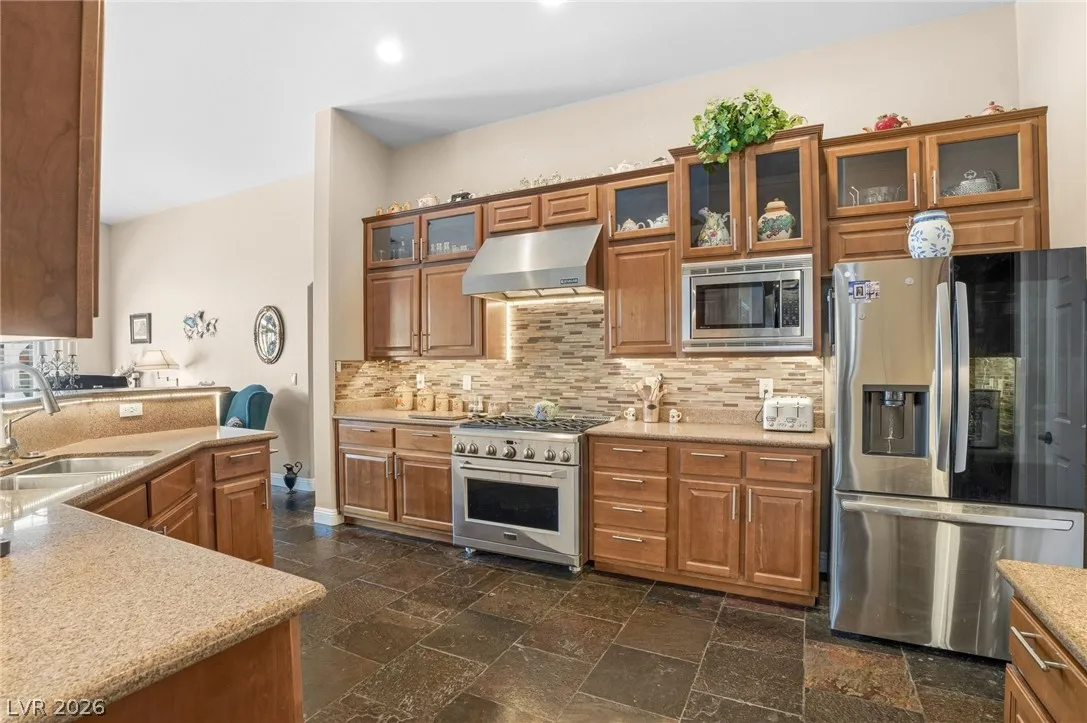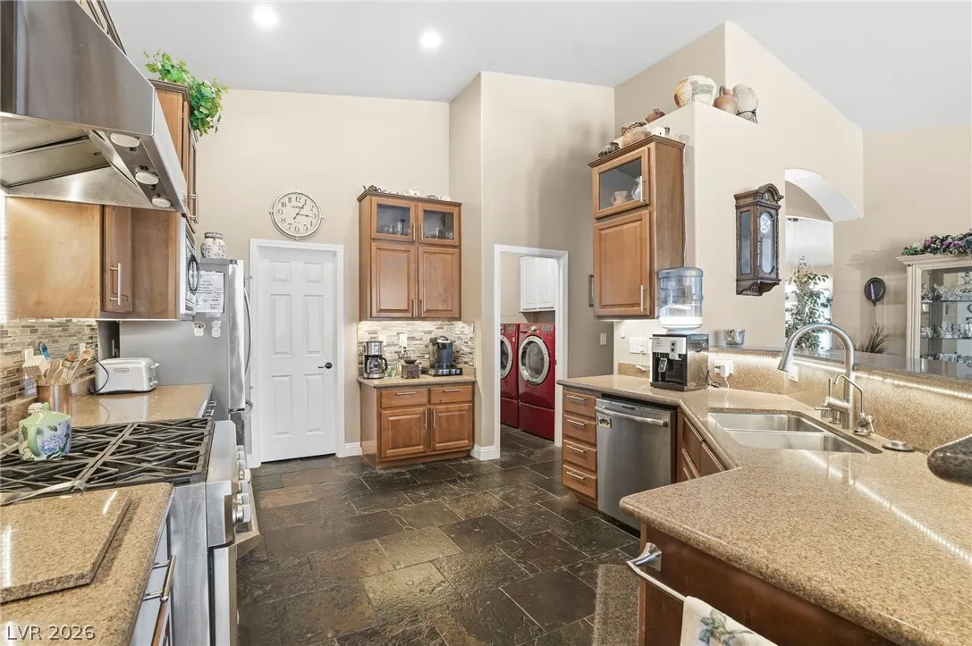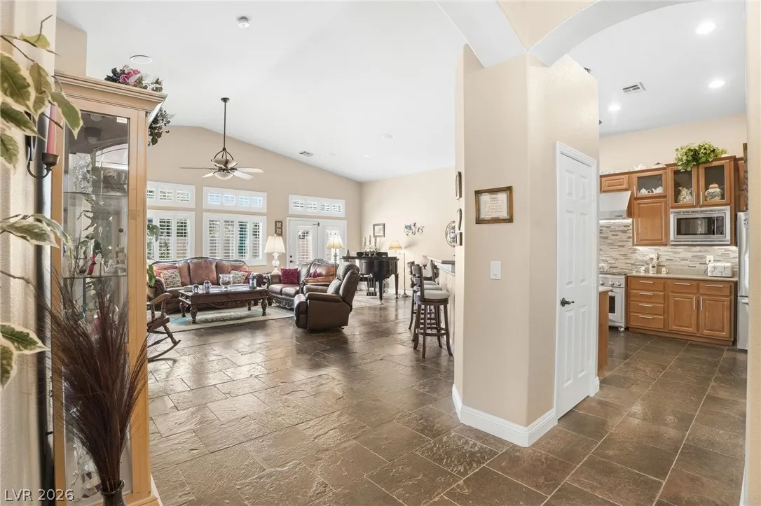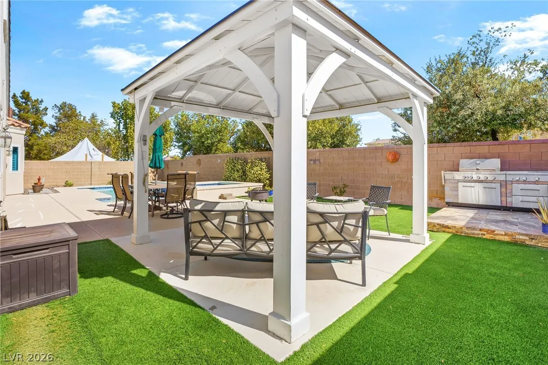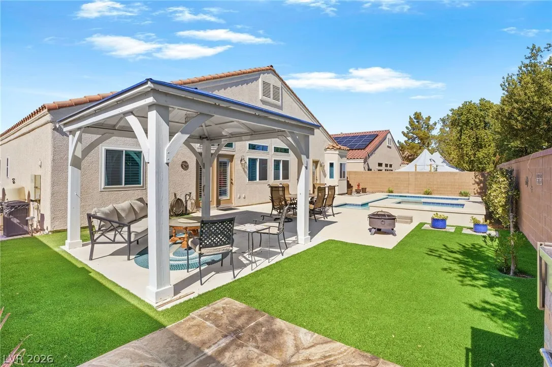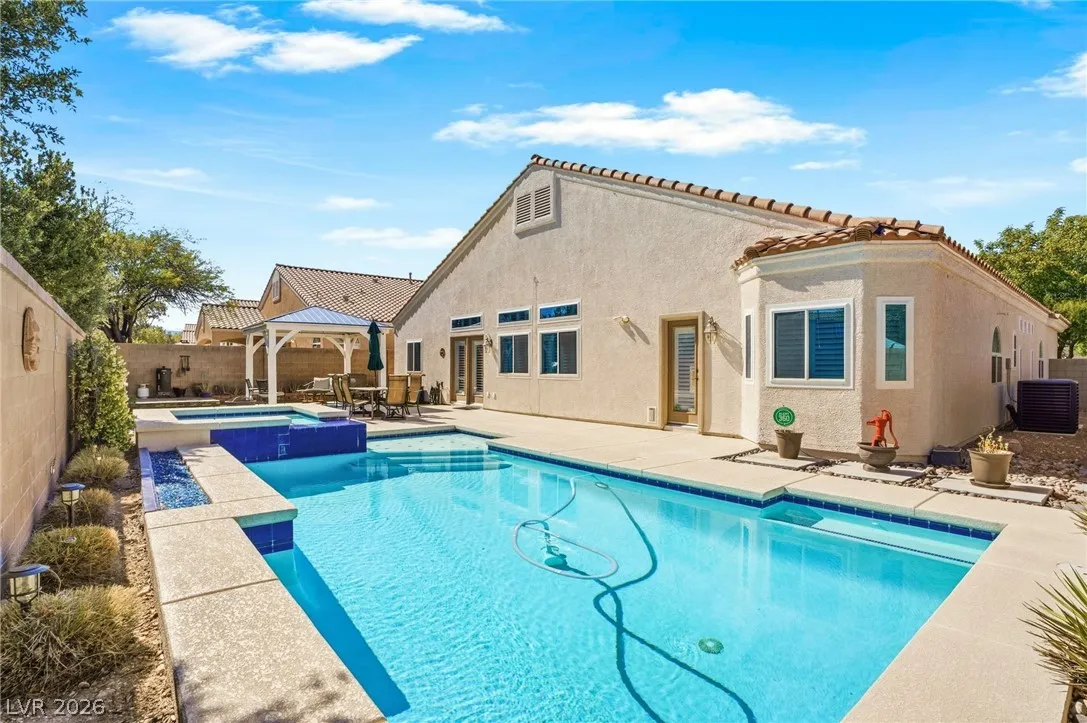 A single story home with TWO primary suites?! Whether you need a home for multi-generational living, accommodating long-term guests, or simply desire the luxury of separation and privacy, this home was built for it. This well maintained home offers a layout perfect for comfortable living, hosting, or simply the privacy most homes can’t offer. Inside, enjoy an open-concept floor plan with vaulted ceilings, a designated dining area, and a well-maintained interior ready for your personal touches. The updated kitchen features a brand new backsplash with all appliances included. Step outside to your private desert retreat, a sparkling pool and spa, a built-in gazebo, and no backyard neighbors. Bedrooms are thoughtfully separated for maximum privacy throughout. Homes with two primary suites at this price point don’t last. Schedule your showing today!