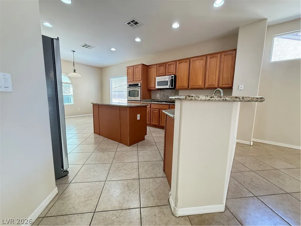 The open kitchen features a convenient island, granite countertops, stainless steel appliances, and a walk-in pantry.