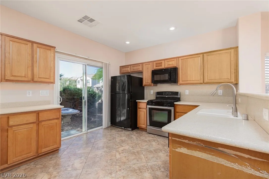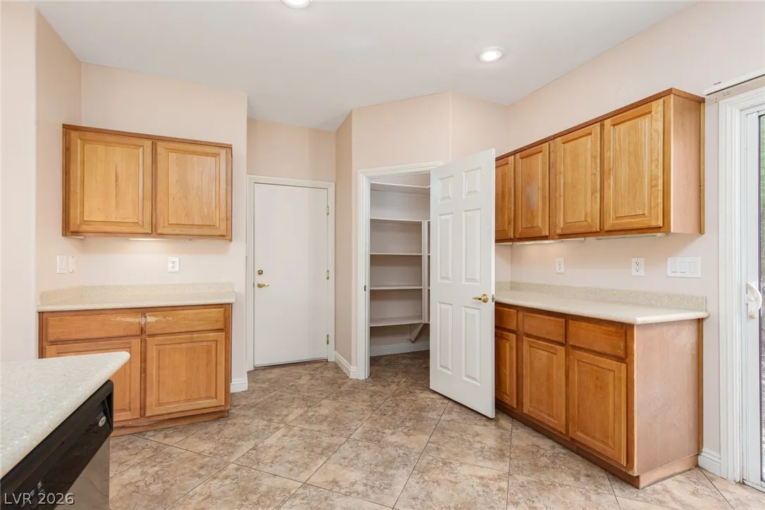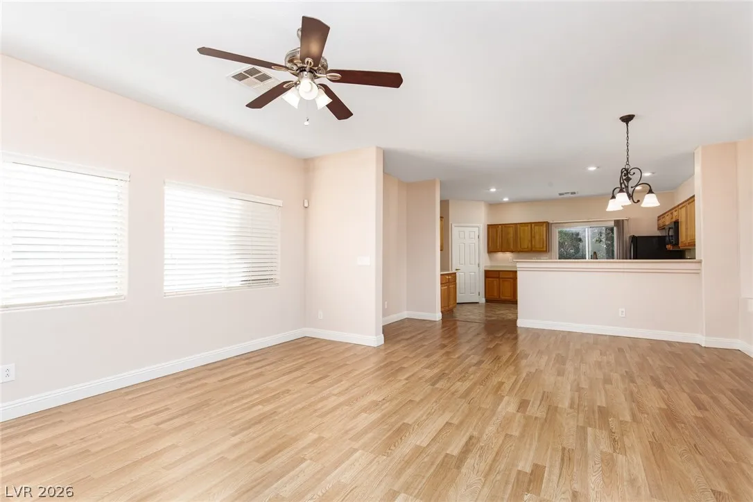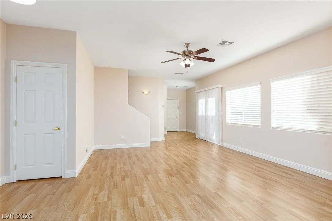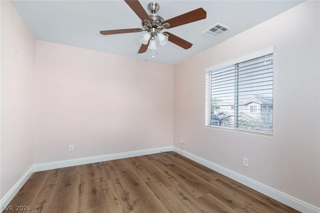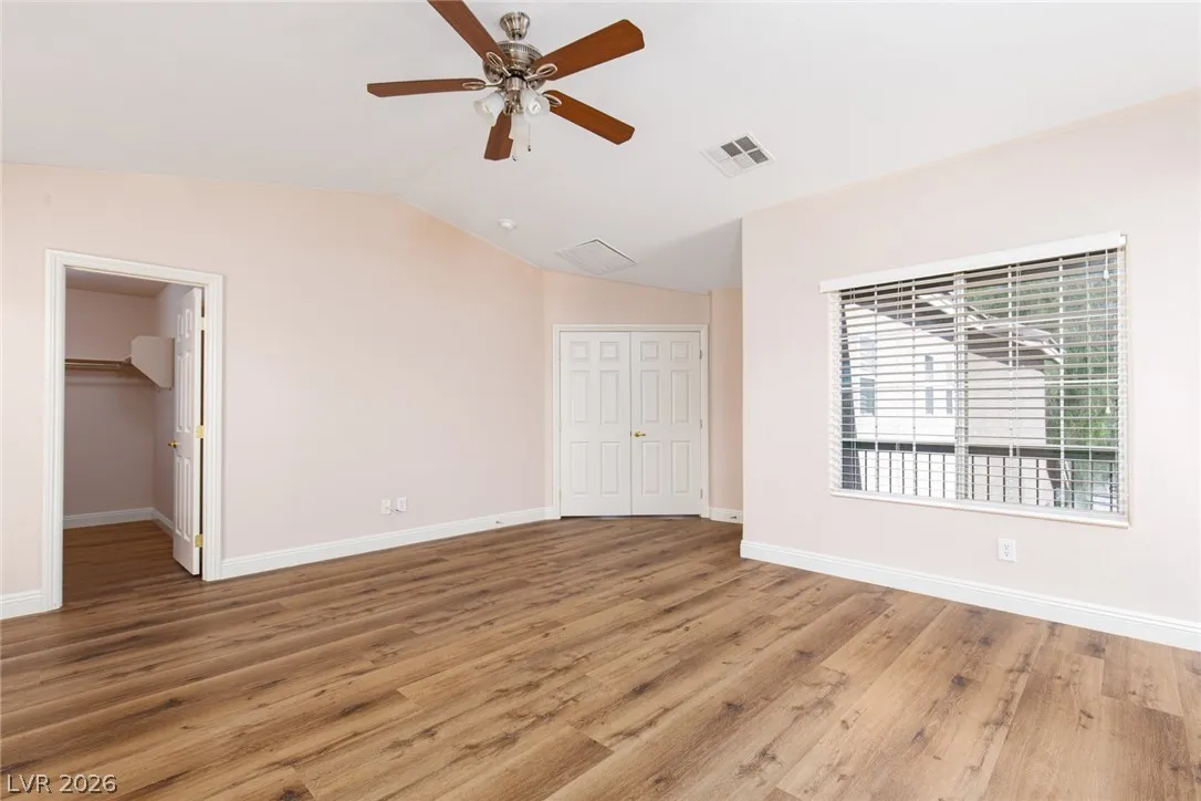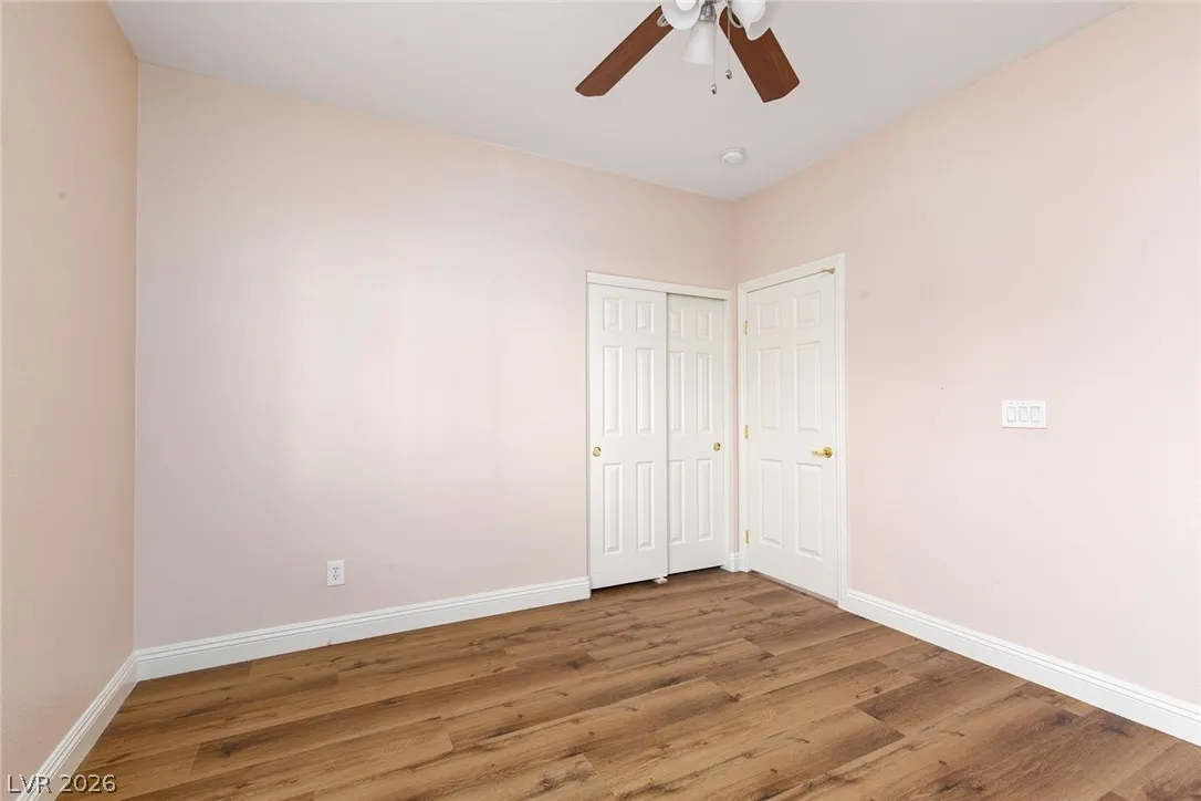 Welcome to your new home in Southwest Las Vegas. This stunning property boasts modern elegance and comfort. Featuring 5 spacious bedrooms, each with ample closet space and ceiling fans, one of the bedrooms and bathrooms is downstairs. The luxurious master suite features a balcony, walk-in closet and dual vanity bathroom with separate tub and shower. The open-concept living area, complete with wood flooring and abundant natural light, flows seamlessly into the gourmet kitchen, equipped with sleek appliances and plenty of storage. Additional highlights include an upstairs laundry room with washer and dryer, a two-car garage, and a prime corner lot location, offering both privacy and convenience.