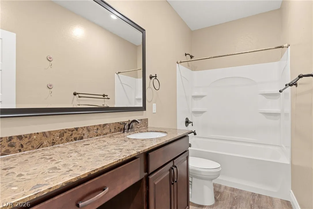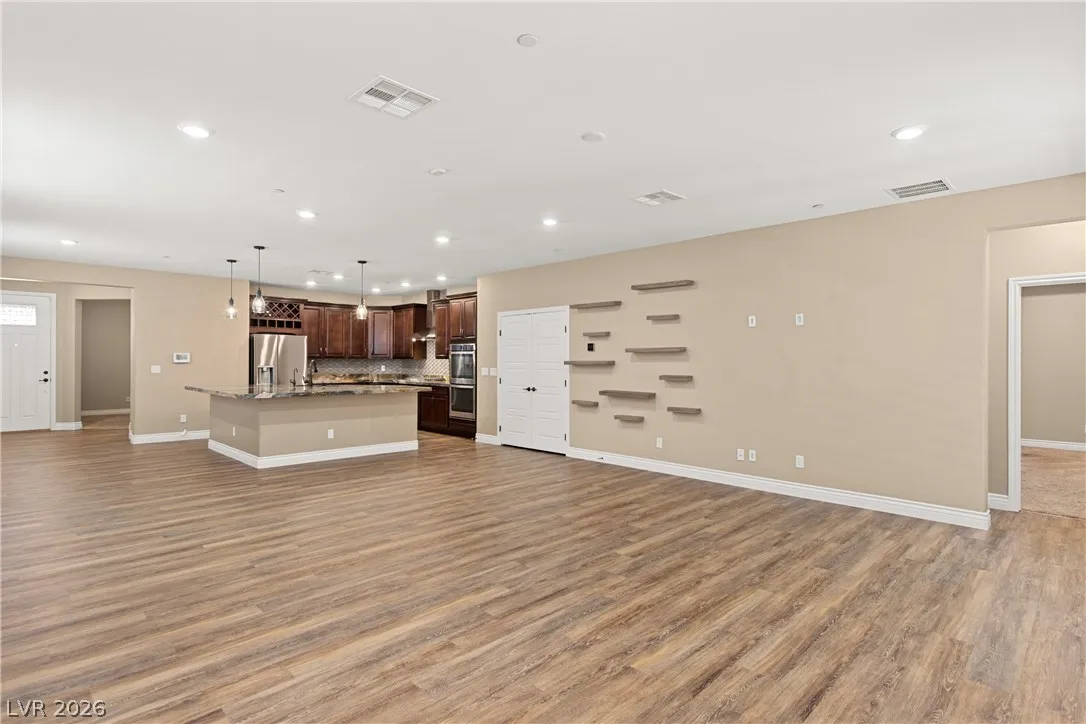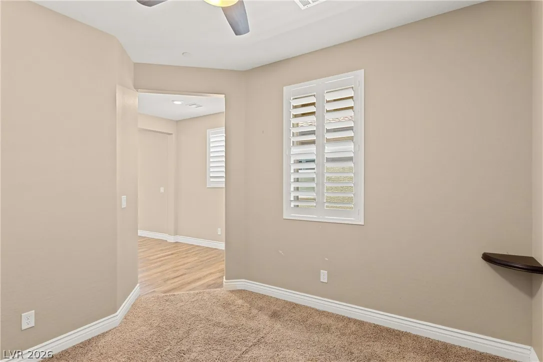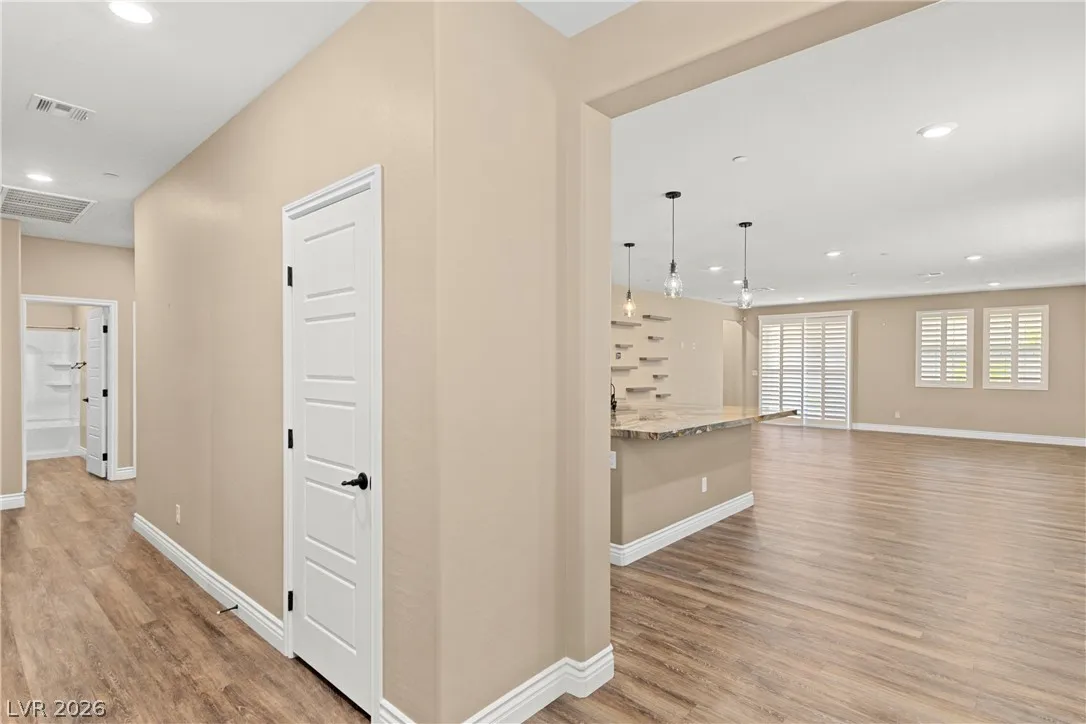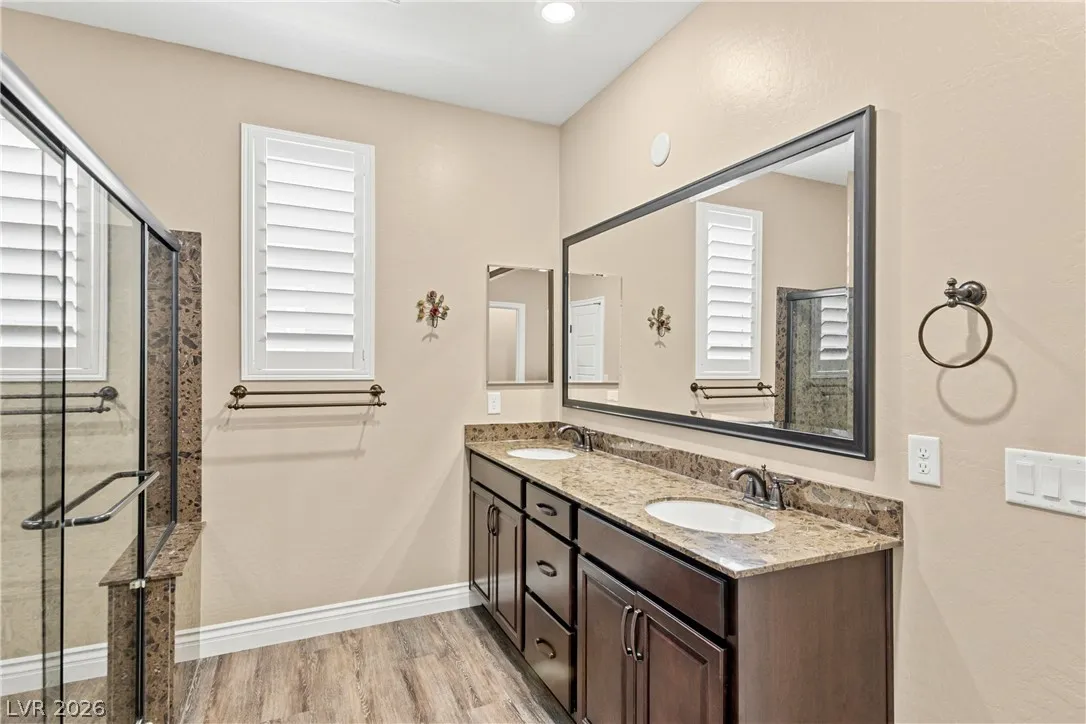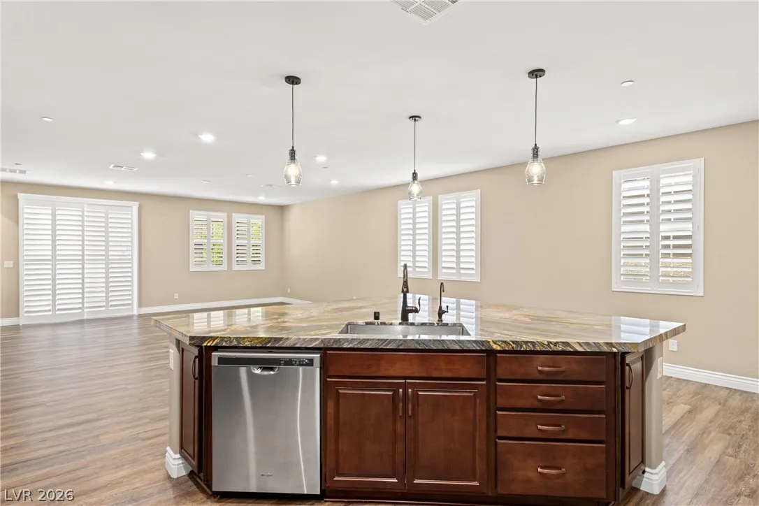 Experience exceptional single-story living in the highly sought-after Inspirada community. This beautifully upgraded 3-bedroom, 2-bathroom home with a spacious den offers a modern open-concept floor plan designed for both comfort and entertaining.The stunning kitchen features custom cabinetry, granite countertops, stainless steel appliances, a double oven, oversized island with seating on two sides, and an impressive walk-in pantry. Plantation shutters throughout the home provide both elegance and privacy while enhancing the upgraded feel of the interior. The spacious primary suite offers a relaxing retreat with a luxurious bathroom featuring an oversized walk-in shower and modern finishes. Two additional bedrooms and a separate den provide flexible living options ideal for a home office, media room, or guest space. Step outside into the beautifully landscaped backyard complete with a covered patio, fire pit, and plenty of room to relax or entertain year-round.